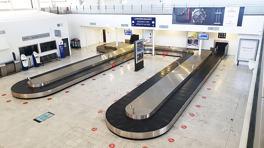 - Traitement des bagages à mains : convoyeur amont/aval rayon X, convoyeur gravitaire pour transfert manuel des bagages, tables de fouille, séparateurs de lignes, chariots à niveau constant de support bacs…